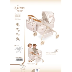 Das Paket enthält: weißen und beigen Puppenkinderwagen mit Spezialdruck aus der Verona-Linie, unteres Ablagefach aus Stoff, Räder mit geräuscharmem Schaumstoffbezug, gepolsterten Lenker, starre Babywanne, ausziehbares Verdeck, passende Kinderwagentasche und weitere luxuriöse Details.