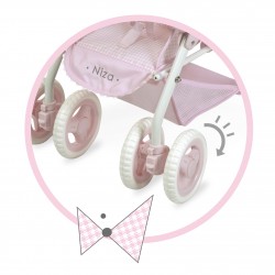 Verwandle das Spiel mit deinen Babypuppen in ein großartiges Erlebnis, indem du Artikel wie diesen wunderschönen Niza Doppelsitz Puppenwagen von DeCuevas Toys hinzufügst. Mit passender Tasche zum Transportieren der Jause und vielem mehr.