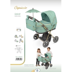 Entdecken Sie eines der besonderen Stücke der neuen Capriccio-Kollektion, einen Puppenwagen voller Farbe, Glanz und Spaßmöglichkeiten für die Familie. Der neue Puppenwagen Capriccio mit Sonnenschirm ist ein sehr spezielles Stück, dank seiner Größe, den Schaumstoffrädern, den goldenen Details und einem praktischen Sonnenschirm zum Schutz des Babys.