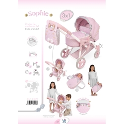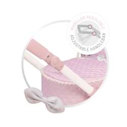 Enthält: 1 Puppenwagen 3 in 1 aus der Kollektion Sophie in Rosa mit weißen und grauen Details, umwandelbar in einen Kinderwagen oder Tragewanne, klappbare Struktur, verstellbarer Griff, schwenkbare Vorderräder, gepolsterter Stoff, gepolsterte Schleifen, gestickte Details, dekorative Knöpfe aus Naturholz, Räder mit Schaumstoffbezug, Abdeckung mit kleiner Tasche, passender Handtasche mit Griffen aus Naturholz, und einer mit passendem Stoff bezogenen Ablage.