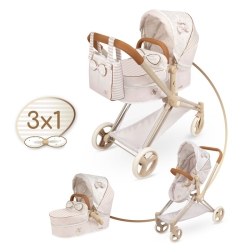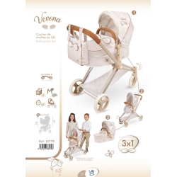 Entdecke diesen eleganten und praktischen Spielzeugwagen, den neuen Puppenwagen Verona 3-in-1, der voller Details steckt und sich in einen Kinderwagen sowie in eine Tragetasche umwandeln lässt. Der Wagen passt sich deinen Bedürfnissen im Rollenspiel an und macht das Erlebnis einzigartig für die Fans des vorteilhaften Rollenspiels.