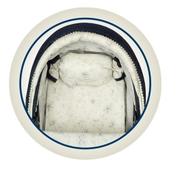 + Im Set enthalten: Blau-weißer Puppenwagen mit Stoffablage, Klappgestell, Matratze, Kopfkissen, Regenschirm und eine zum Wagen passende Kindertasche.